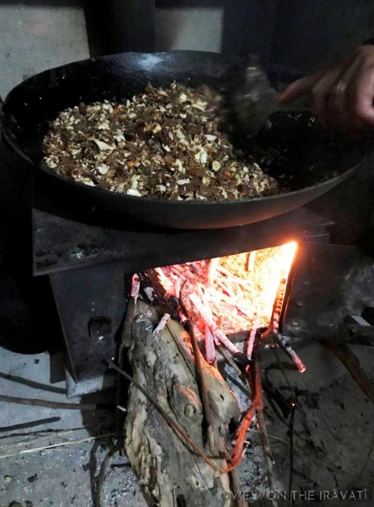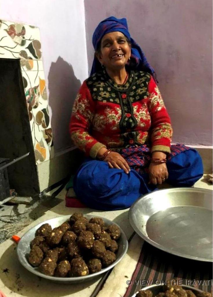 Finally, we are sitting by the kitchen fire on a cold winter’s day preparing to make alsī laḍḍūs. My khākho has a stack of wood next to her and we have prepped all of the ingredients.